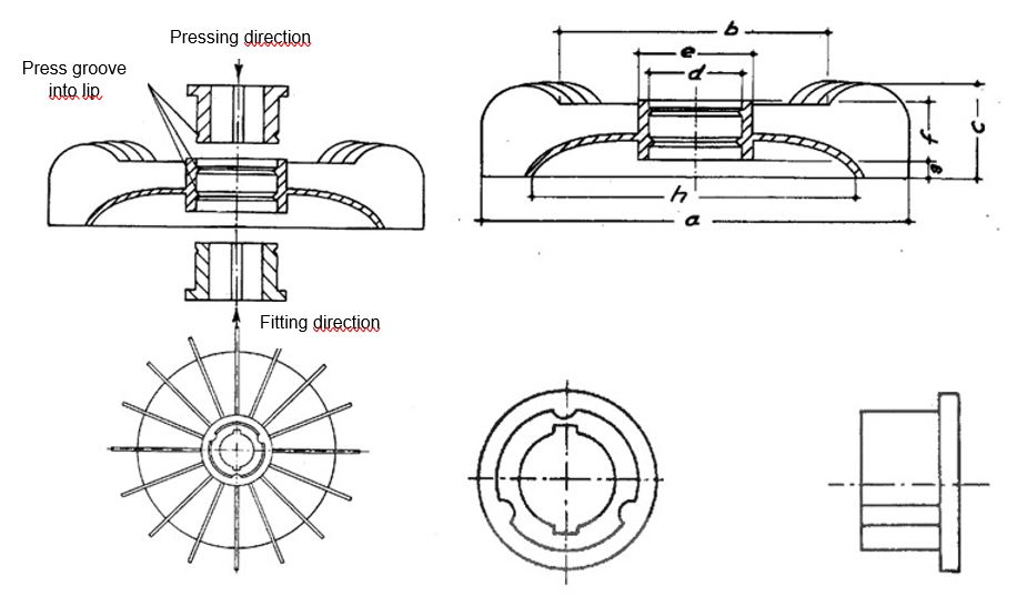 Si nécessaire, la douille peut être montée et goupillée préalablement sur l’axe du moteur, avec le montage du ventilateur par la suite. Ce procédé est très avantageux en cas de bouts d’arbres courts. Pour garantir une utilisation aussi universelle que possible, la forme du ventilateur est très peu courbe. Cela permet d’étendre leurs utilisations à une gamme de moteurs plus large. La matière des ailes reste toujours assez molle pour permettre un éventuel découpage. Une douille peut toujours être utilisée pour deux tailles de ventilateurs.