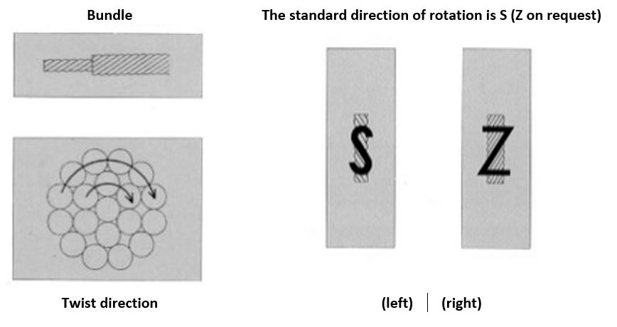 Pour le câblage des torons haute fréquence, il existe également un paramètre supplémentaire, le sens de la torsion. Il décrit la direction dans laquelle le toron est vrillé/torsadé. En principe, on distingue les sens de câblage S et Z. Le sens de câblage S est le sens de câblage le plus courant.