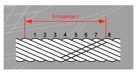 Die Schlaglänge einer bestimmten Litzenlage in einem Drahtseil ist die Ganghöhe der schraubenlinienförmig liegenden Litzen dieser Lage.